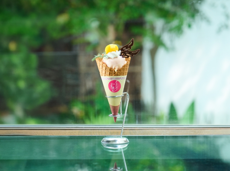 紫芋と栗を使ったジェラートを贅沢に使用し、天使の羽を思わせる繊細なトッピングで『受胎告知』の神秘的な色彩を表現。和の趣を添えた美しい一品は、手軽に食べ歩きできるスタイルで、秋の街歩きに彩りを添えます。