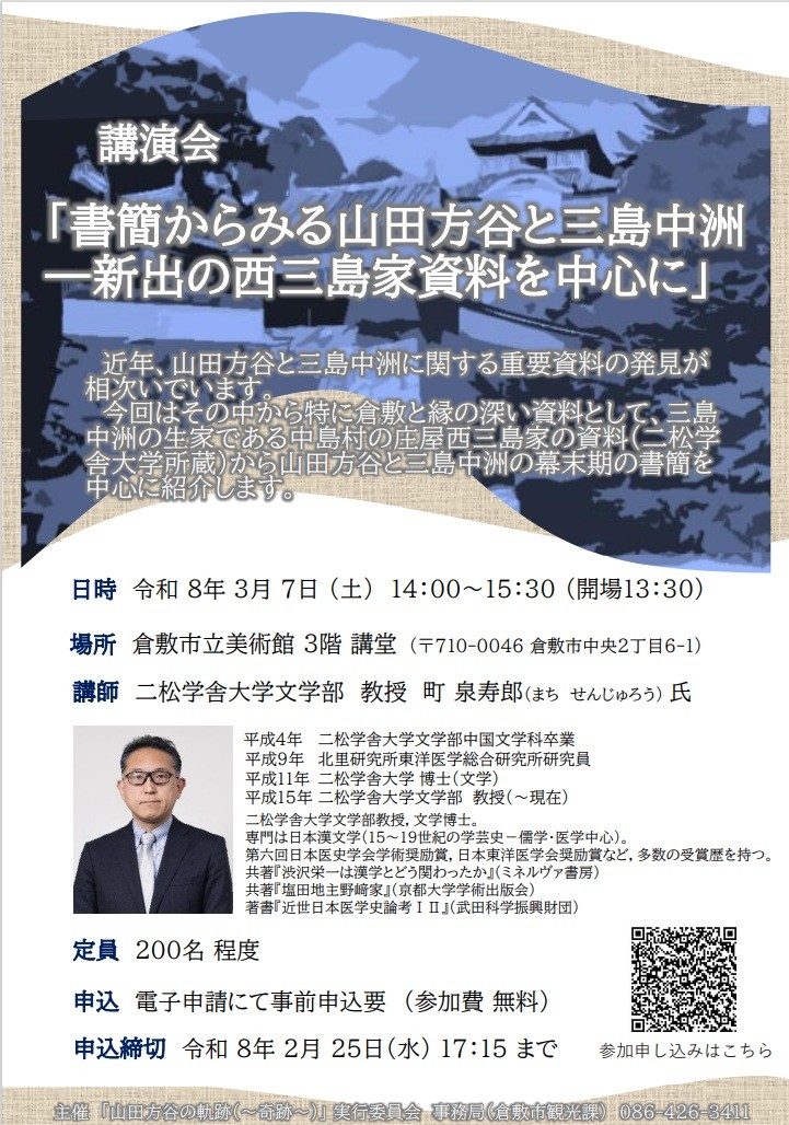 講演会「書簡からみる山田方谷と三島中洲 ―新出の西三島家資料を中心に」受講者募集
