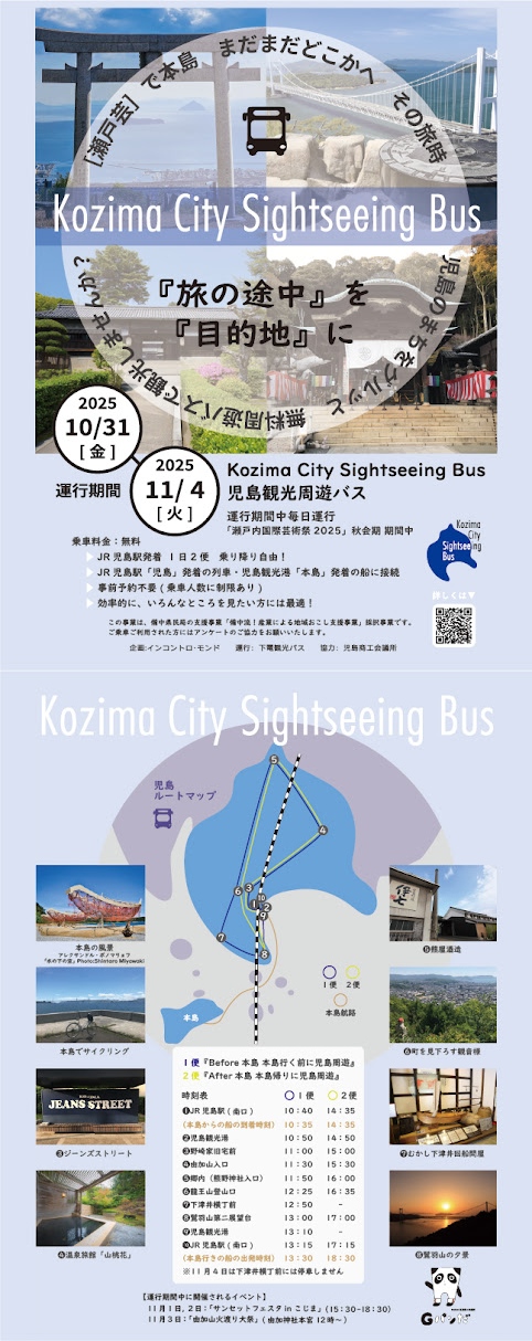 10月31日から11月4日までの5日間限定で、JR児島駅発着の児島観光周遊バス「Kozima City Sightseeing Bus」が実証運行します。