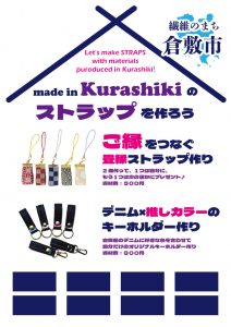倉敷市を代表する織物である「デニム」と「畳縁」を使用し、自分だけのオリジナルストラップ・キーホルダーを製作するワークショップを体験できます(有料)。多くのボランティアが協力し、初めての方でも安心して楽しめるようサポートします。倉敷の伝統技術に触れ、思い出に残る「ものづくり体験」をお楽しみください。
