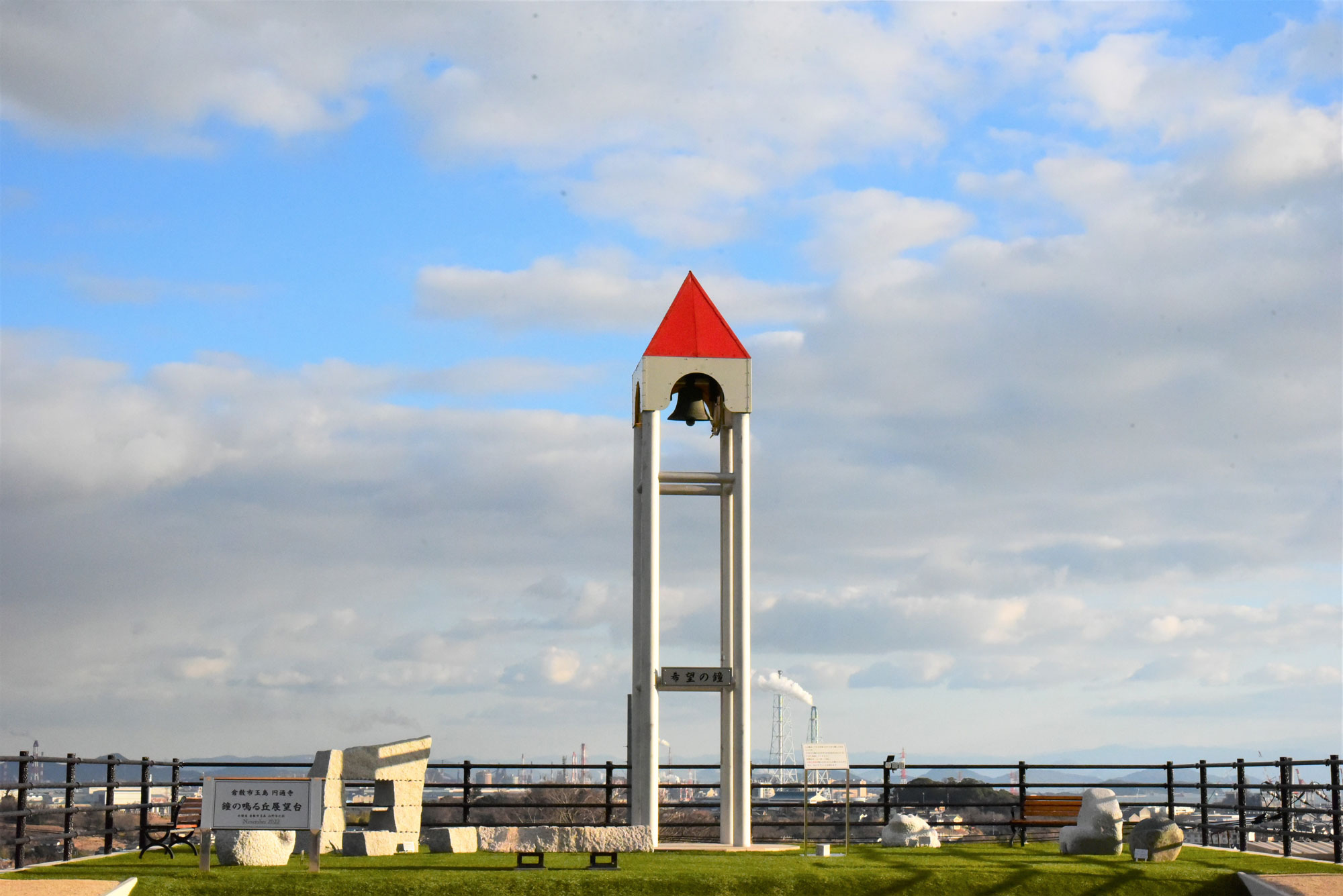 良寛さん修行の寺「円通寺」の駐車場に2022年に設置された展望台です。 展望台からは、玉島の港町や水島工業地帯を一望できます。また、展望台には高さが7.6メートルある鐘塔が設置されており、実際に鳴らすこともできます。 その周囲には石の彫刻作品が展示してあり、景色とともに芸術作品を楽しむことのできるスポットです。