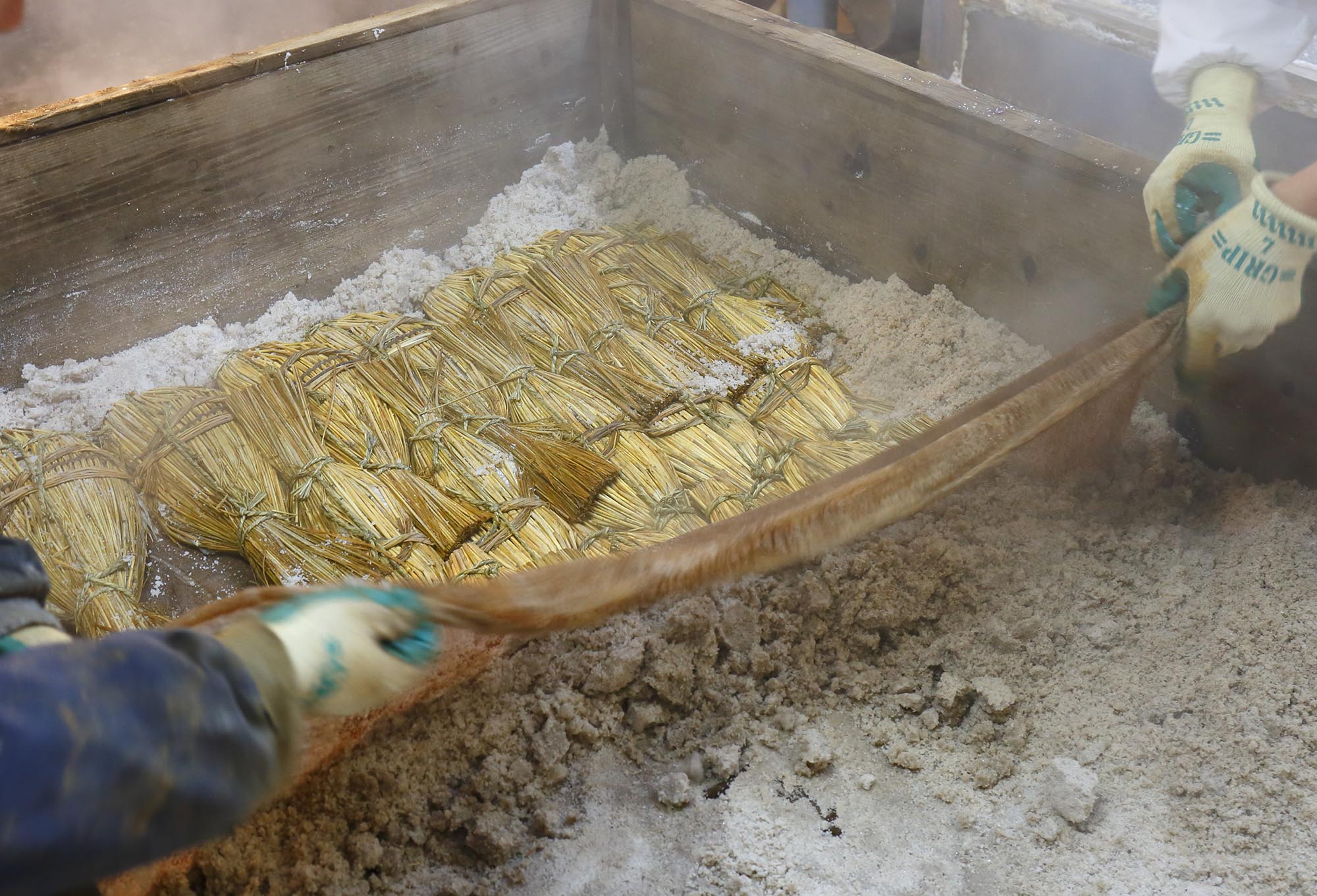 約2時間塩蒸し焼きにした後、わらの香りと塩の風味が漂う中で慎重に鯛を取り出し、すぐに吊るして1時間ほど急速に冷ますと、身が引き締まって色よく仕上がります。