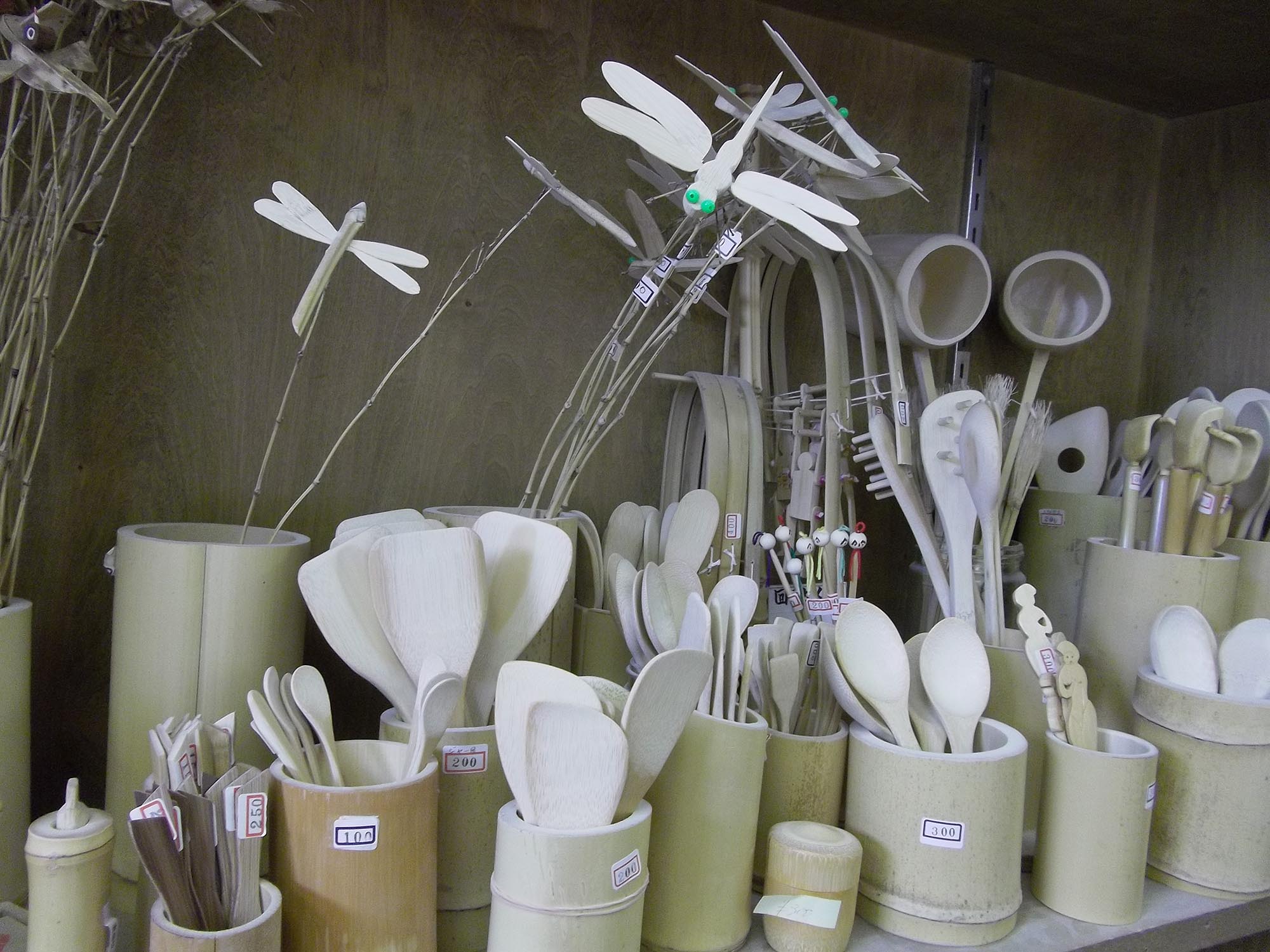 たけのこの産地倉敷市真備町、竹素材を有効活用して竹製小物細工製品や竹家具、雑貨といった多種多様な竹製品が作られています。