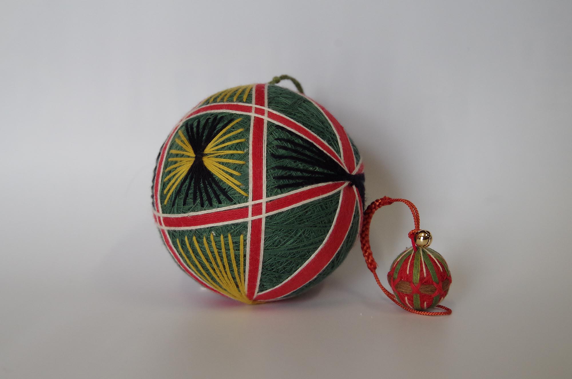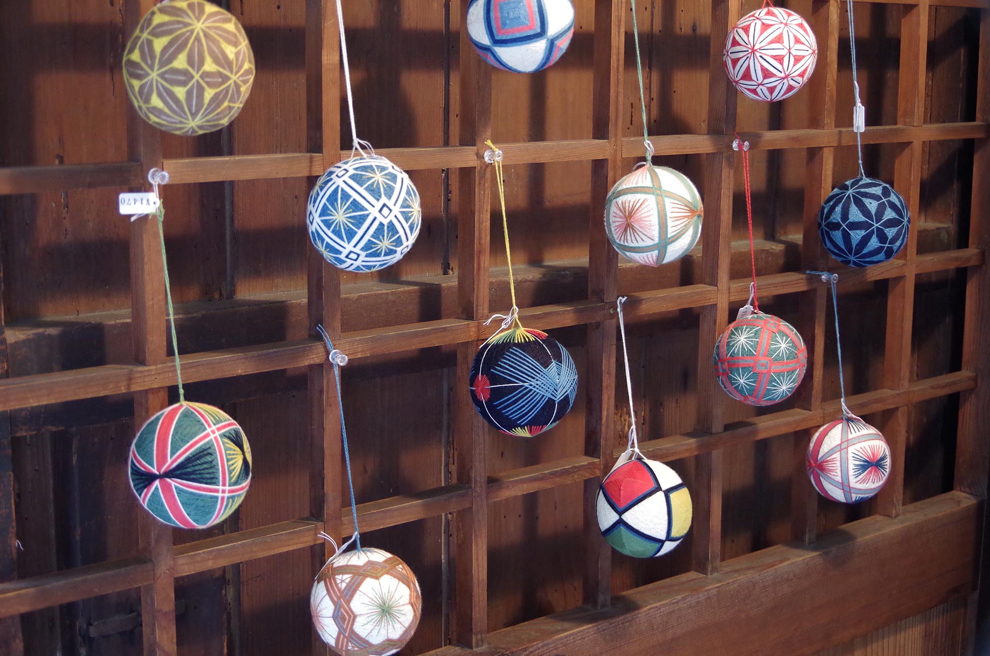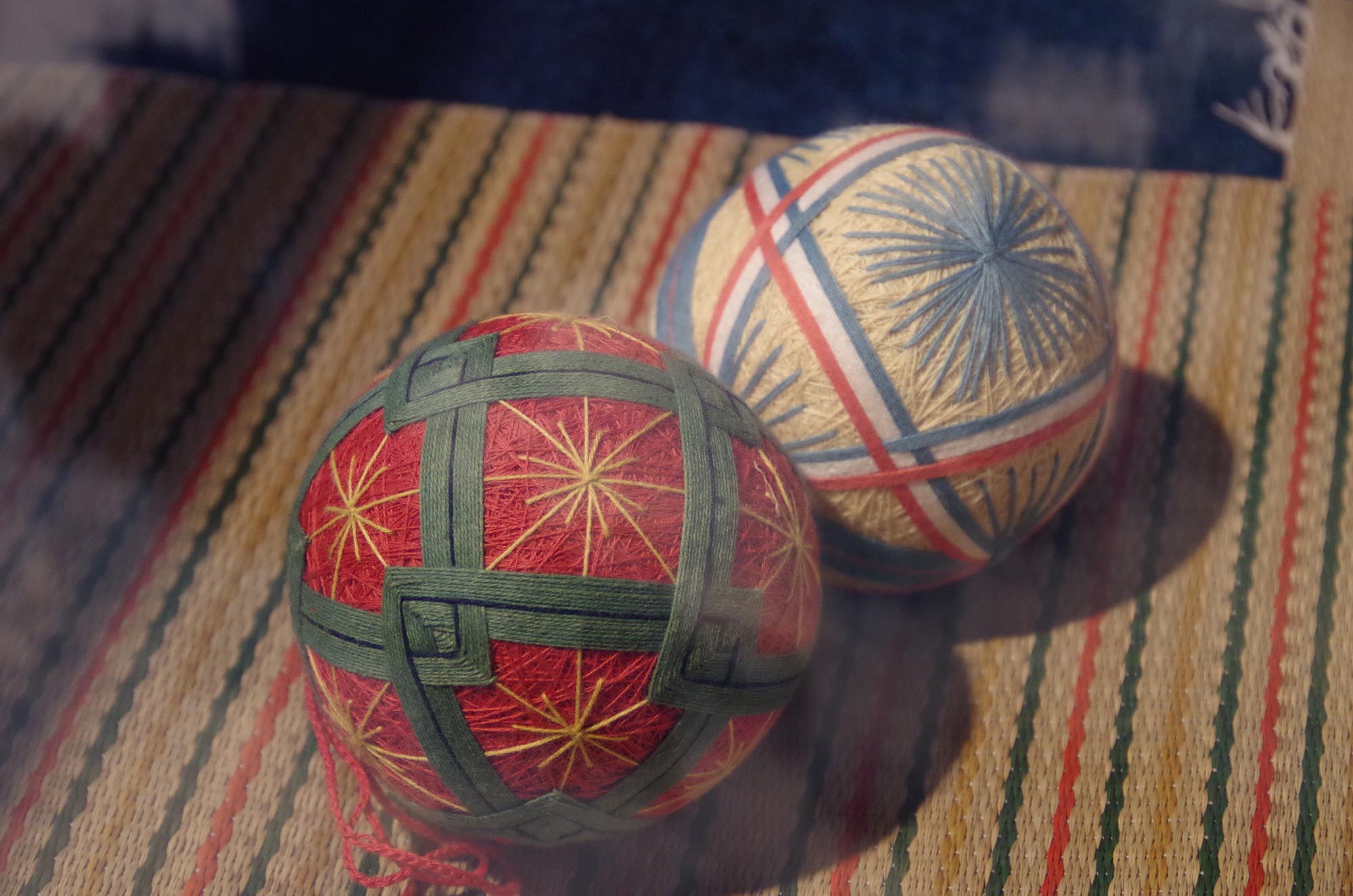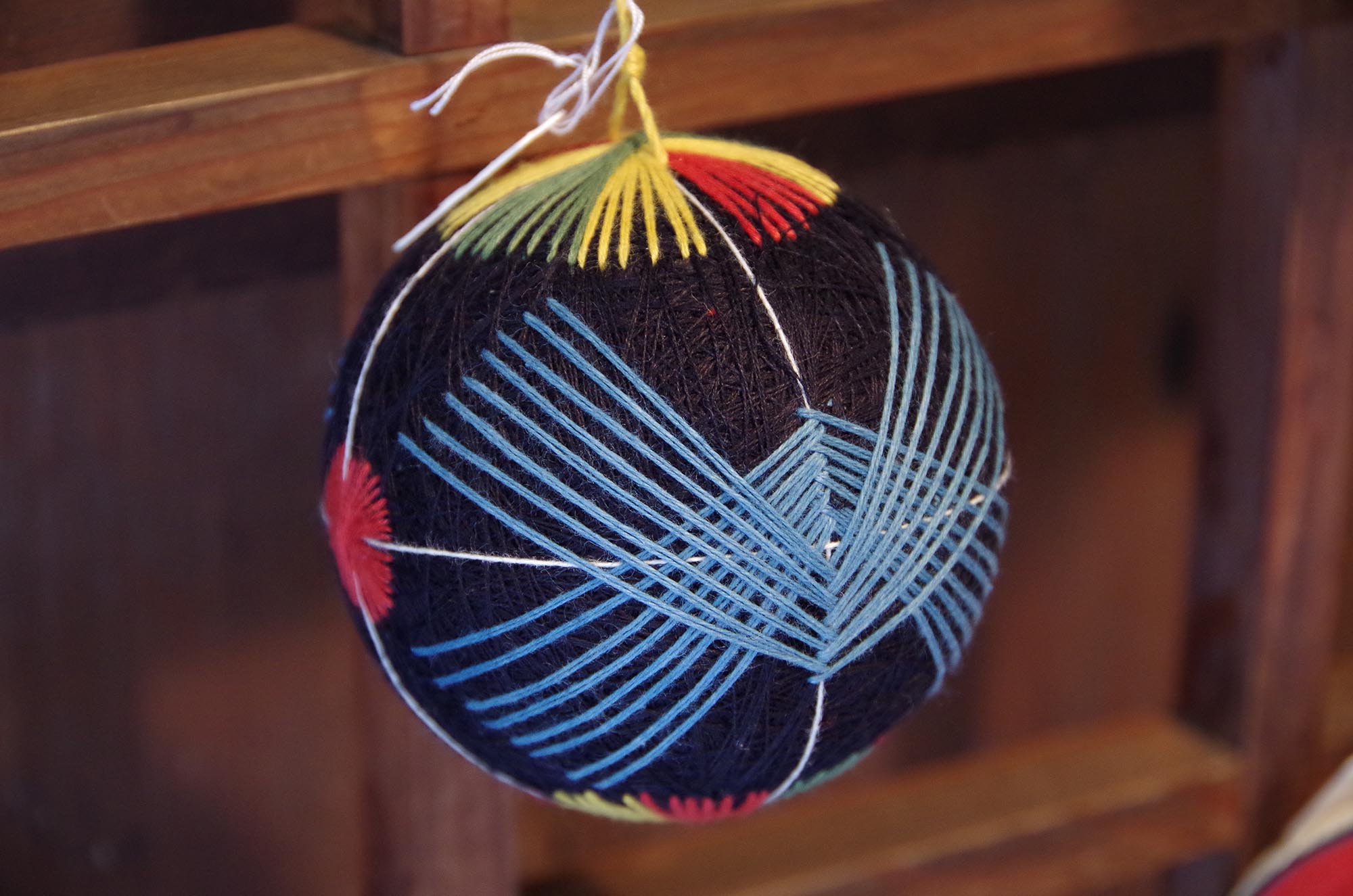 作り方は、もみ殻を詰めたものを芯として、木綿糸を使って周囲を巻き、さらにかがり(刺繍)を行います。言葉で書くと簡単そうですが、実際は真円を出すことや色の組み合わせが難しく、外村氏の指導もかなり厳しかったと聞きます。現在でも糸の染色も含めて一つ一つ手作業で作られている倉敷てまりからは、作り手の「伝統を守り伝えよう」という意気込みが感じられる気がします。