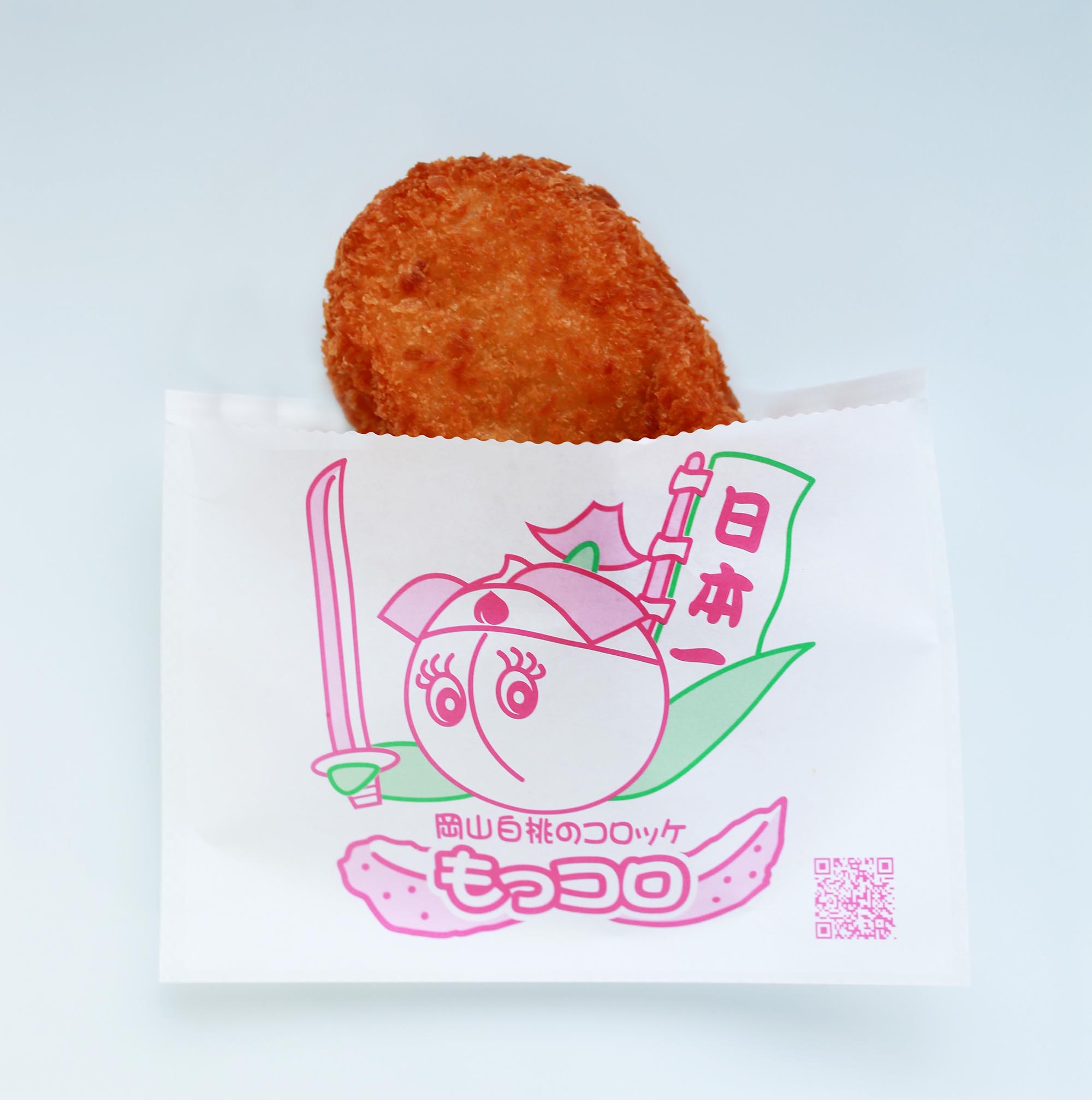 フルーツ王国と称する岡山県の白桃は、生産に適した地質や土質、また、温暖な気候に恵まれ、きめ細かい果肉、ほんのりとした心地よい香りと上品な甘さが特徴的です。そして、一つ一つ丁寧に袋かけし、透き通ったような白さを併せ持ったことから高級品として取り扱われています。その白桃を使用したユニークなコロッケが「もっコロ」です。