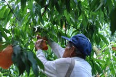倉敷産の白桃と言っても、白鳳、清水白桃、おかやま夢白桃、白麗、とたくさんのものがあります。その中でも最高峰に位置するブランド桃の「清水白桃」は、とろけるようにやわらかく、とても甘いのが特徴です。7月、8月に収穫時期をむかえ、天候にも敏感に左右されるので栽培には、生産者のたいへんな苦労があります。それ故にその品質と味わいには定評があり自信を持ってお奨めすることが出来る地元の旬の味わいです。清水白桃は、倉敷市で一番作付けが多い桃の品種ですが、倉敷市内の産地として、玉島、真備、浅原地区があります。いずれも日当たりの良い山間で温暖な気候の下、おいしくて健康な桃が育つよう土壌づくりから始まりせん定、摘蕾(てきらい)や摘果(てきか)、袋掛けなど、手間ひまをかけて栽培がおこなわれています。
