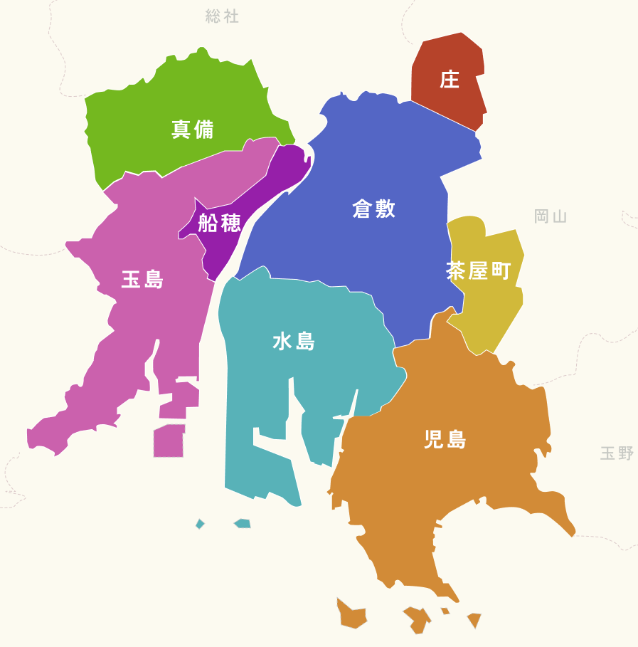 倉敷市では美観地区のある「倉敷エリア」、工業地帯の「水島エリア」、瀬戸内の風景が広がる「児島エリア」、ノスタルジックな街並みの「玉島エリア」、その他「真備」「船穂」「庄」「茶屋町」とエリアごとで異なる風景が広がっています。