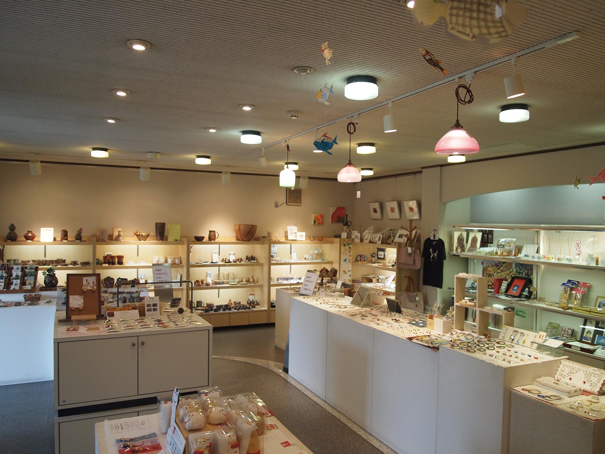 1階のミュージアムショップは、気軽に入れて手頃な価格なものが多いのが魅力。地元で活躍する若手作家や大学の卒業生による陶芸やガラス工芸、染色作品のほか、手作りのアクセサリーやデザイナーセレクトの小物雑貨などが数多く展示・販売されています。ほとんどが1点もので、同じ形のものでもどこか少しずつ違う部分があり、そのときの出逢いとひらめきが、倉敷の思い出を凝縮した一品になるはずです。また、店内に設置されている「備前焼ガチャガチャ」(500円)は、カプセル内に備前焼の箸置きやブローチが入っていて当たりが出ると備前焼の器がもらえるという、ここにしかないオリジナルのガチャガチャです。