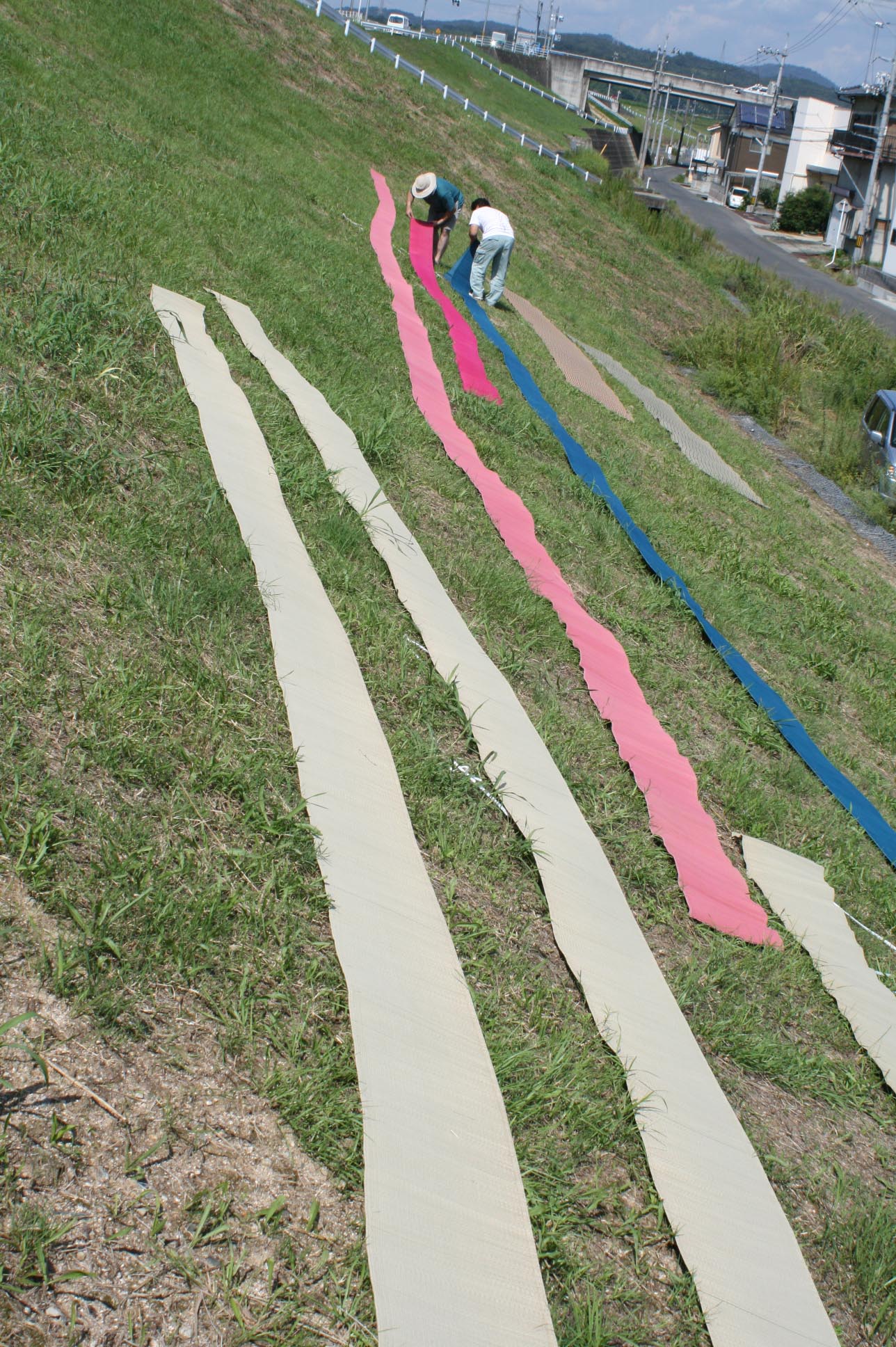 この下流一直線に伸びる堤防道路は南北に伸びており、その東斜面を利用して日光を十分に当てることで、織り上げたイ草に含まれる湿気を取ります。イ草は色づけされてから織るため、そのままにしておくとカビが生えてしまいます。そこで、天日干しをするのですが、乾燥機を使うよりもイ草の芯まで乾かすことができるので、日光が最適だそうです。