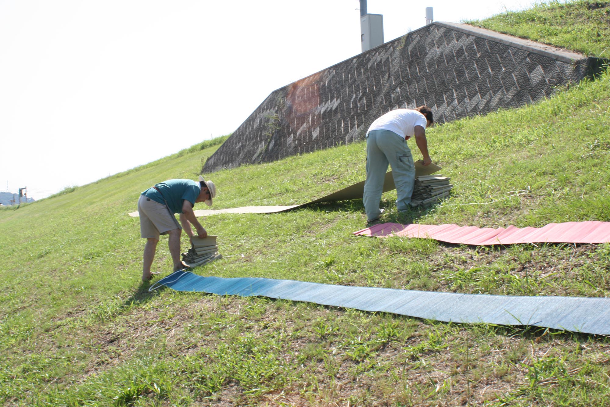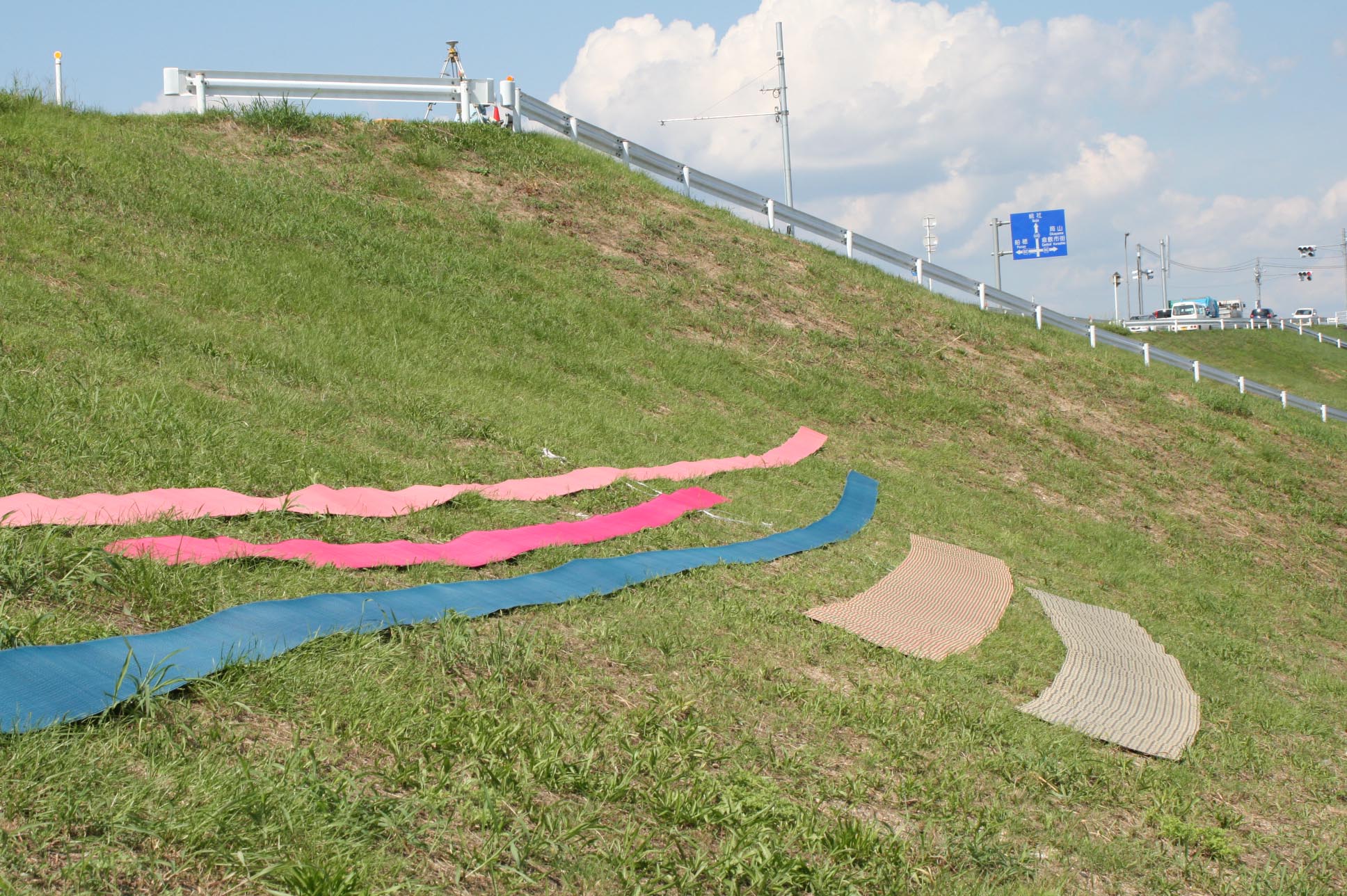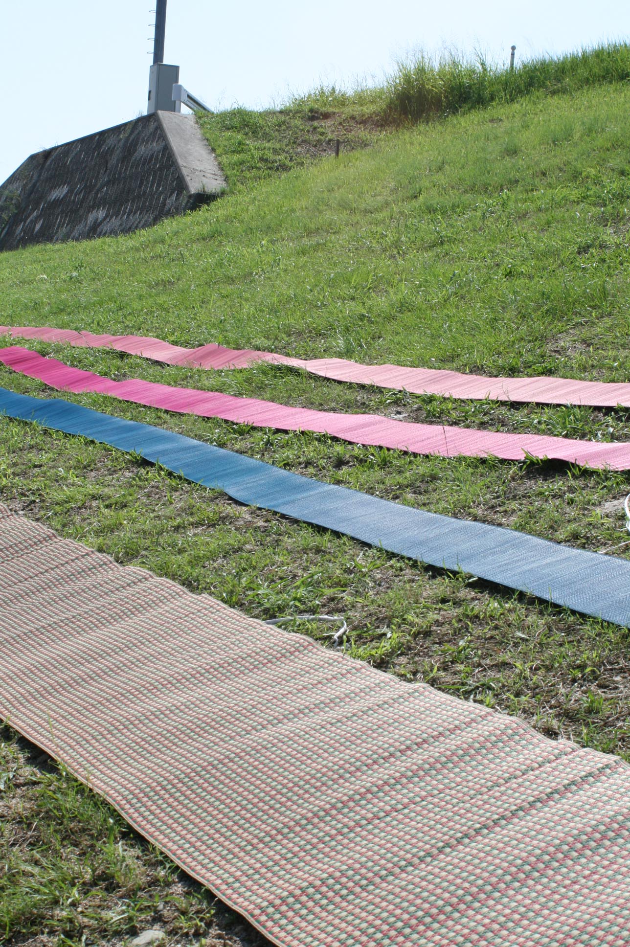 この下流一直線に伸びる堤防道路は南北に伸びており、その東斜面を利用して日光を十分に当てることで、織り上げたイ草に含まれる湿気を取ります。イ草は色づけされてから織るため、そのままにしておくとカビが生えてしまいます。そこで、天日干しをするのですが、乾燥機を使うよりもイ草の芯まで乾かすことができるので、日光が最適だそうです。