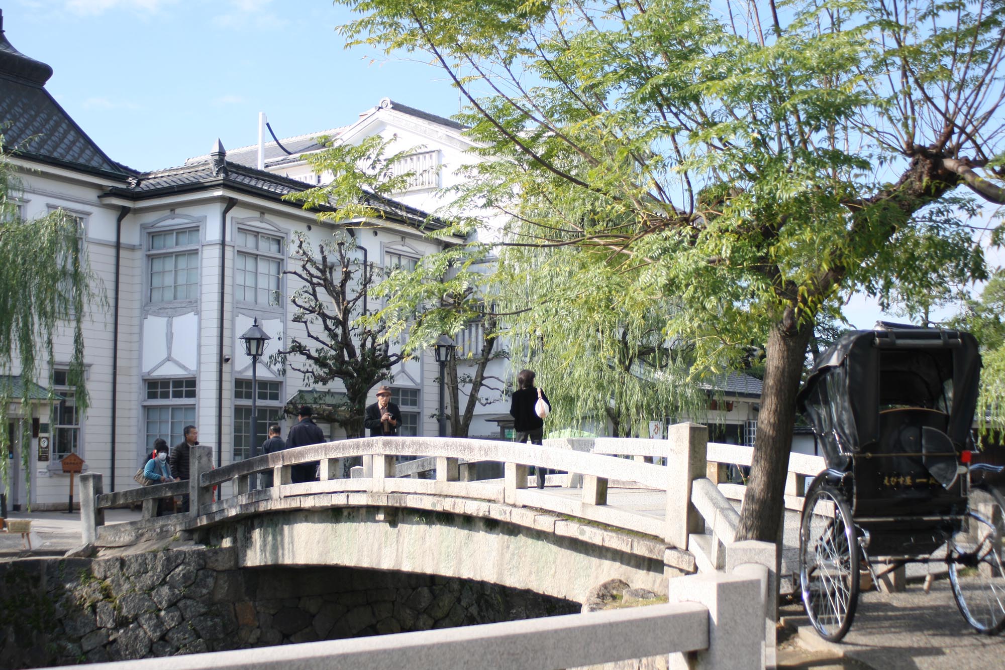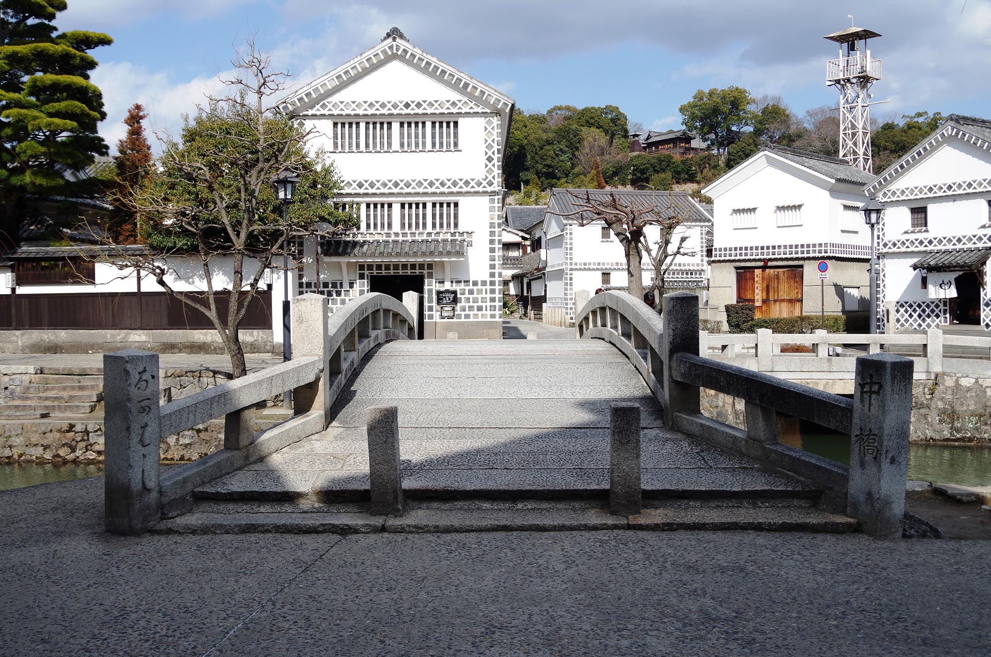倉敷美観地区内の倉敷川中間に位置する「中橋」。橋を挟んで、大正時代に町役場として建てられた「倉敷館」と、江戸時代の米蔵を改装して、この地の遺跡調査の研究結果を展示している「倉敷考古館」があります。