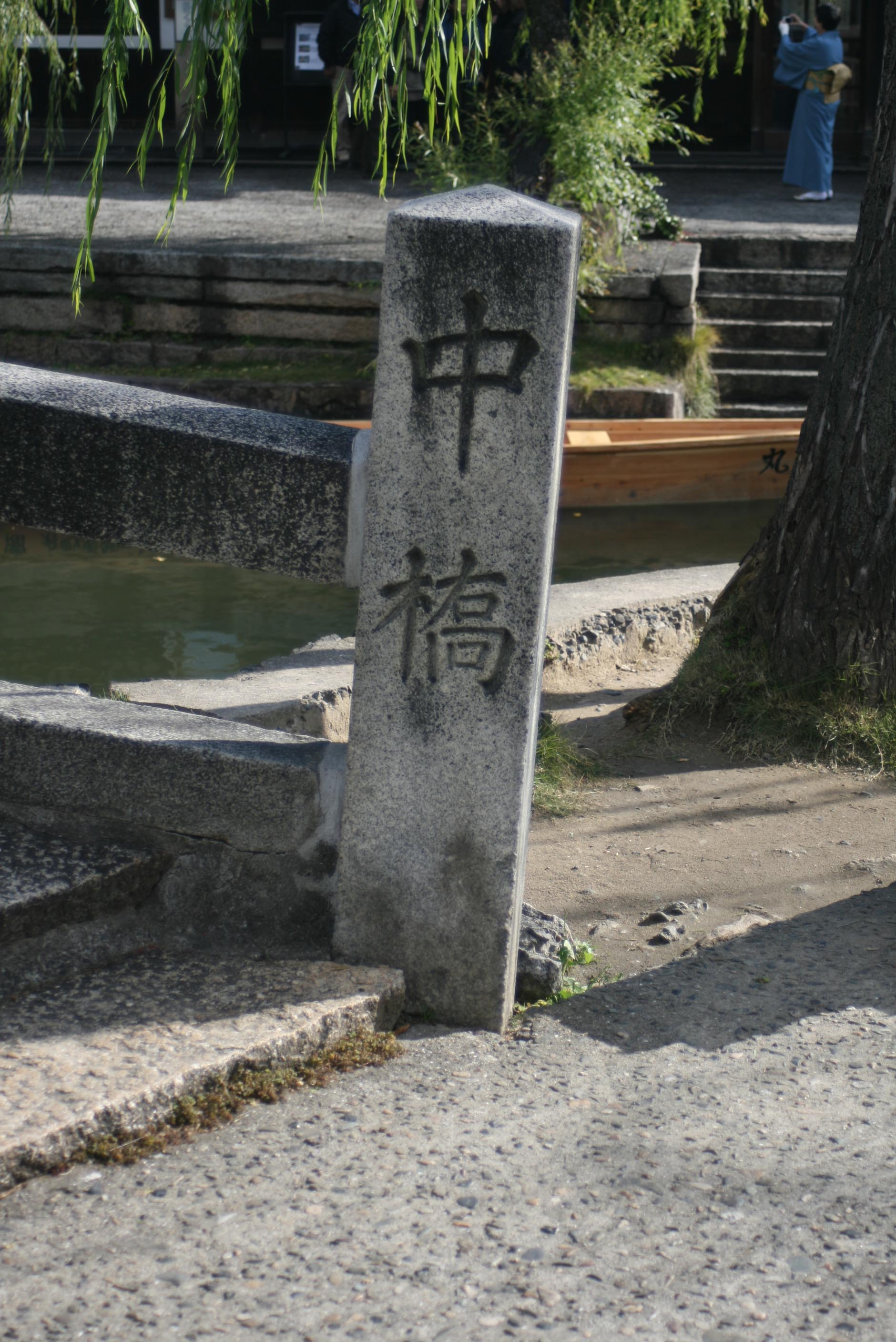 この中橋は単径間桁橋という種類の橋で、橋の中央に向けて太鼓状に湾曲しているため、橋の下を通る舟の往来が容易になります。また、市民や観光客にとって倉敷美観地区の象徴的な建造物の一つであるこの石橋は、明治前期までは木造であったそうです。橋が壊れたのを期に、明治10年(1877年)に石橋に架け替えられたのですが、その際、当時の倉敷村会議員であった原唯七氏により左右の橋柱にそれぞれ漢字と変体仮名で橋名が刻字されたと言われています。刻字された「橋」の字は略字であり、変体仮名も今では珍しいので、すんなりと読める人は少ないかもしれません。