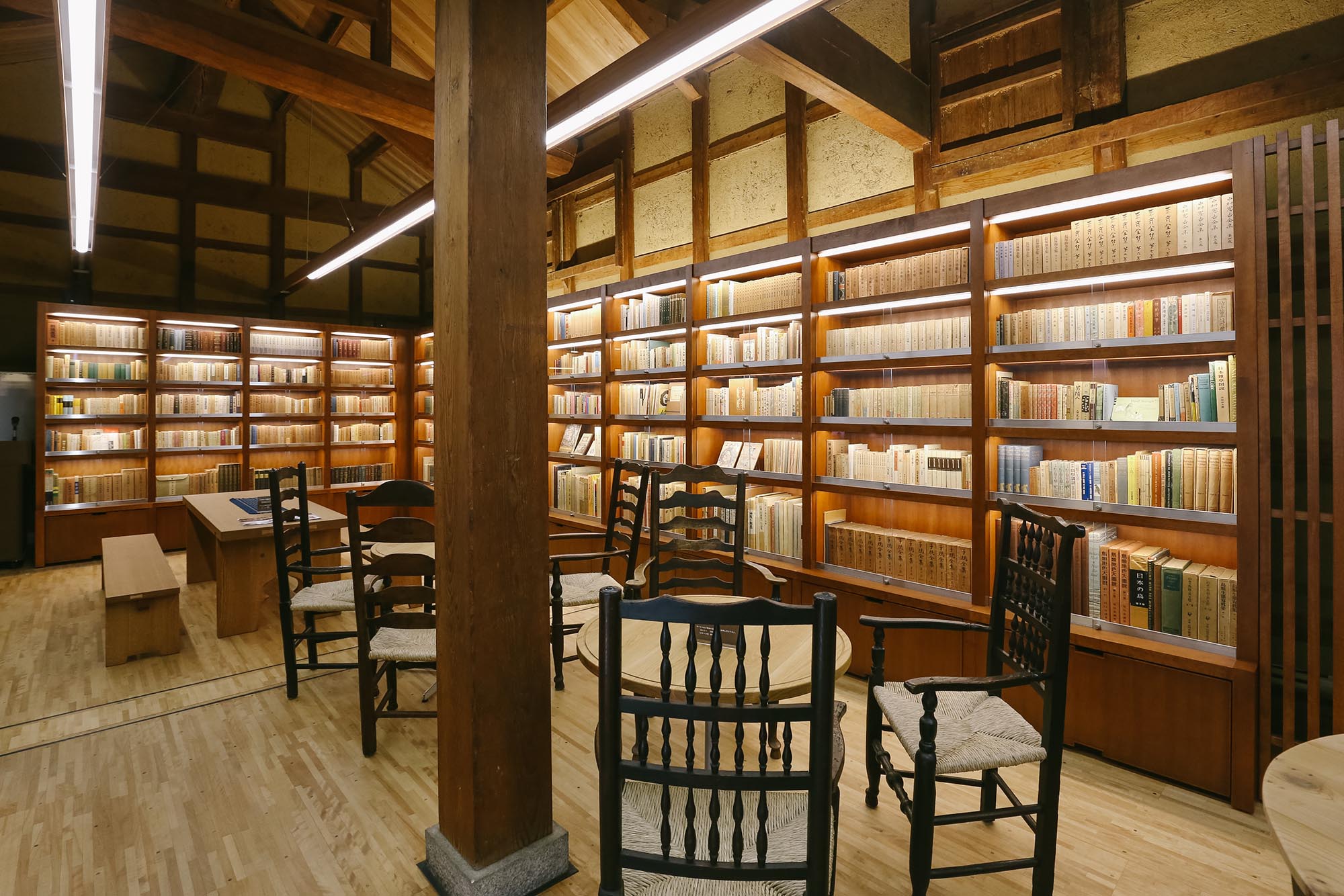 大原總一郎の膨大な蔵書の中から、一部である約2000冊が展示されています。たくさんの蔵書に囲まれた空間で、大原家で実際に使われていたウィンザーチェアに座り、コーヒーとスイーツを楽しめます。