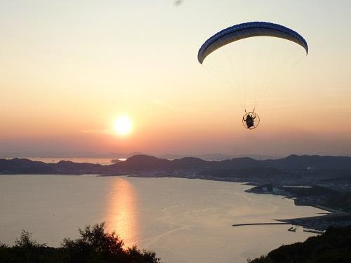 また、山頂からは瀬戸大橋をはじめ備讃瀬戸の景観を一望でき、遠く四国連山も視界におさめることができます。施設としては、200台収容の無料駐車場、休憩のできる王子が岳パークセンター、展望台、野外ステージなどもあります。また、山腹に沿って頂上付近まで続く遊歩道が整備されており、春にはサクラやツツジなどが咲き誇る手頃なハイキングコースとして親しまれています。さらに切り立った崖の上にはパラグライダーの発着場があり、ここ王子が岳は全国でも屈指のパラグライダーフライト場としても有名です。まるで鳶が空を自由に舞うように、幾つものパラグライダーが華やかに空中を飛び交っています。