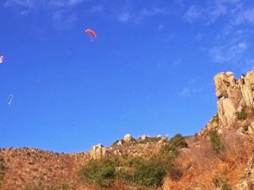 また、山頂からは瀬戸大橋をはじめ備讃瀬戸の景観を一望でき、遠く四国連山も視界におさめることができます。施設としては、200台収容の無料駐車場、休憩のできる王子が岳パークセンター、展望台、野外ステージなどもあります。また、山腹に沿って頂上付近まで続く遊歩道が整備されており、春にはサクラやツツジなどが咲き誇る手頃なハイキングコースとして親しまれています。さらに切り立った崖の上にはパラグライダーの発着場があり、ここ王子が岳は全国でも屈指のパラグライダーフライト場としても有名です。まるで鳶が空を自由に舞うように、幾つものパラグライダーが華やかに空中を飛び交っています。
