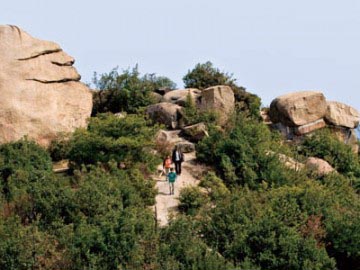 岡山県下最大の海水浴場がある渋川海岸に隣接する王子が岳は、瀬戸内海国立公園に指定されている標高234mの風光明媚な山です。大小さまざまな花崗岩の奇岩・巨岩がいくつも点在しており、海岸から切り立った巨石、奇石が織り成す石の造形美は、厳しさと雄大さを兼ね備えています。「おじさん岩」「にこにこ岩」「ひつじ岩」など名づけられた岩の間を巡る遊歩道もあり、散策を楽しみながら色々な岩の表情を目にすることが出来ます。