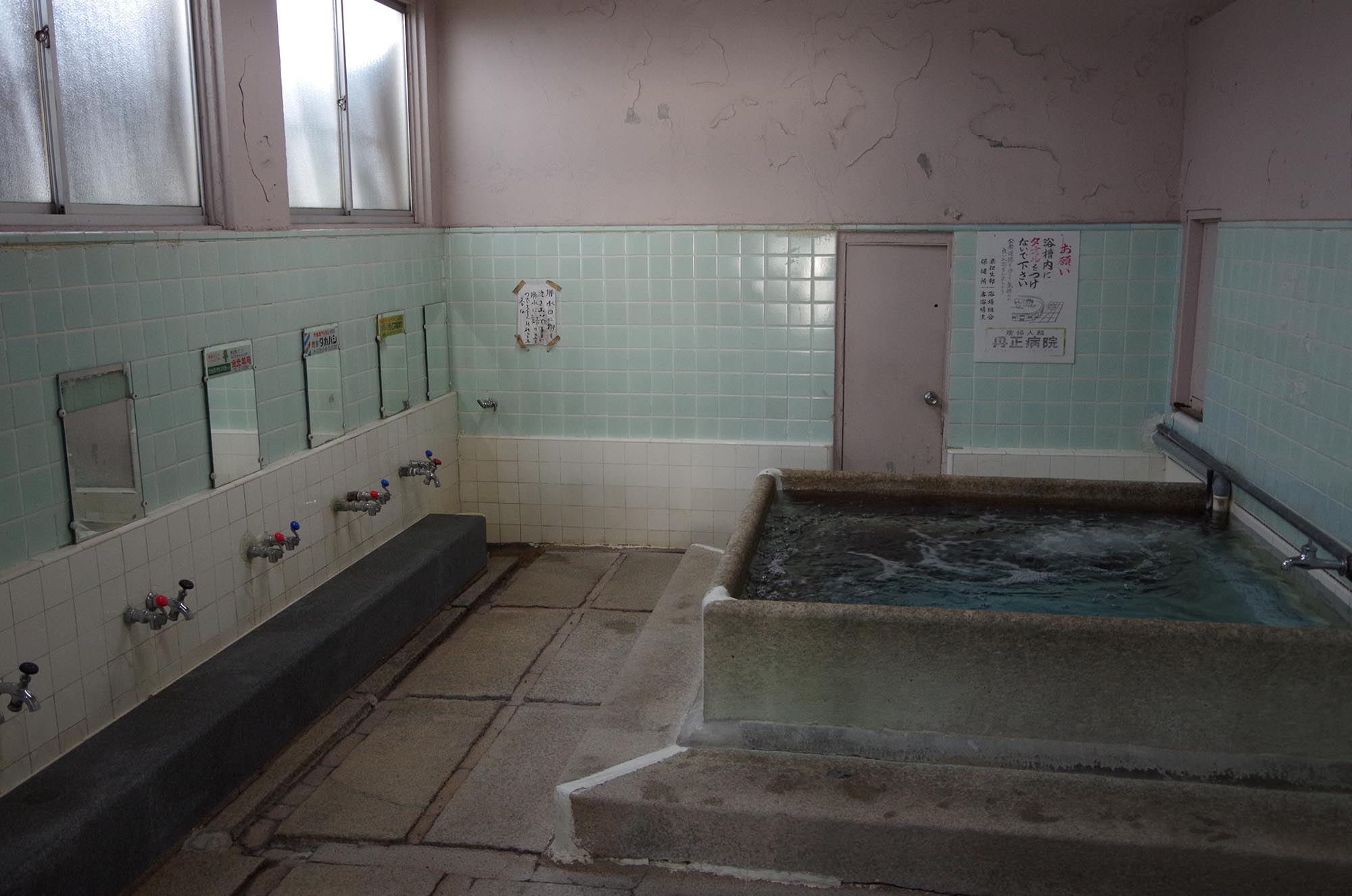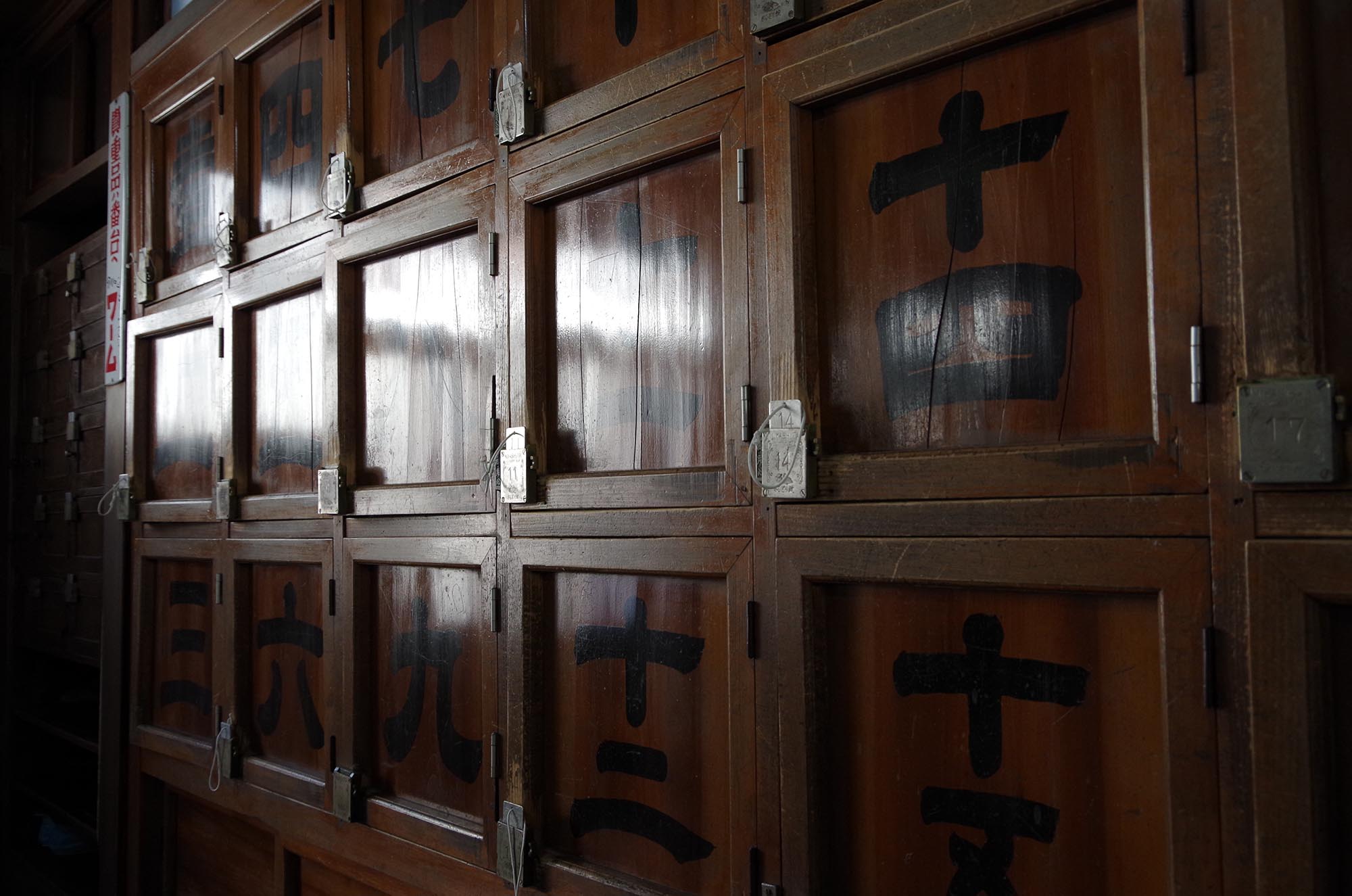 のれんを潜って中に入ると、外観と同じく内装もほとんど当時のままで、木づくりの下駄箱やロッカーは、今ではほとんど見ることのできない貴重なものとなっています。また、浴室の床と浴槽は御影石を使用していて、これも当時のまま。
