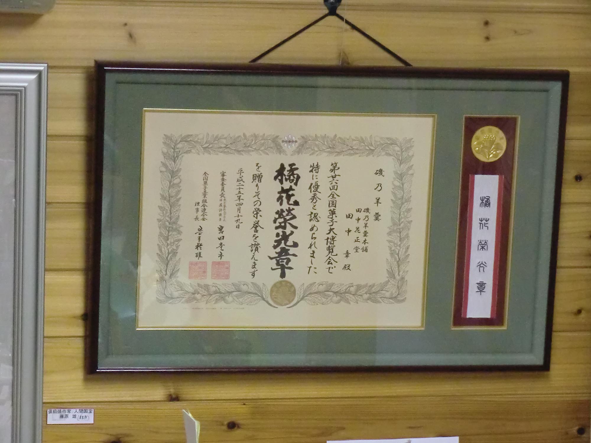 昭和29年(1954年)「第13回全国菓子大博覧会(京都府)」に「磯乃羊羹」を創業者が出品し、見事「進歩一等賞」を受賞。当菓子博覧会は4年ごとに全国の都道府県の持ち回りで開催され、平成25年(2013年)「ひろしま菓子博2013」(第26回全国菓子大博覧会)に出品し、特に優秀と評価され「橘花榮光章」を受賞しました。
