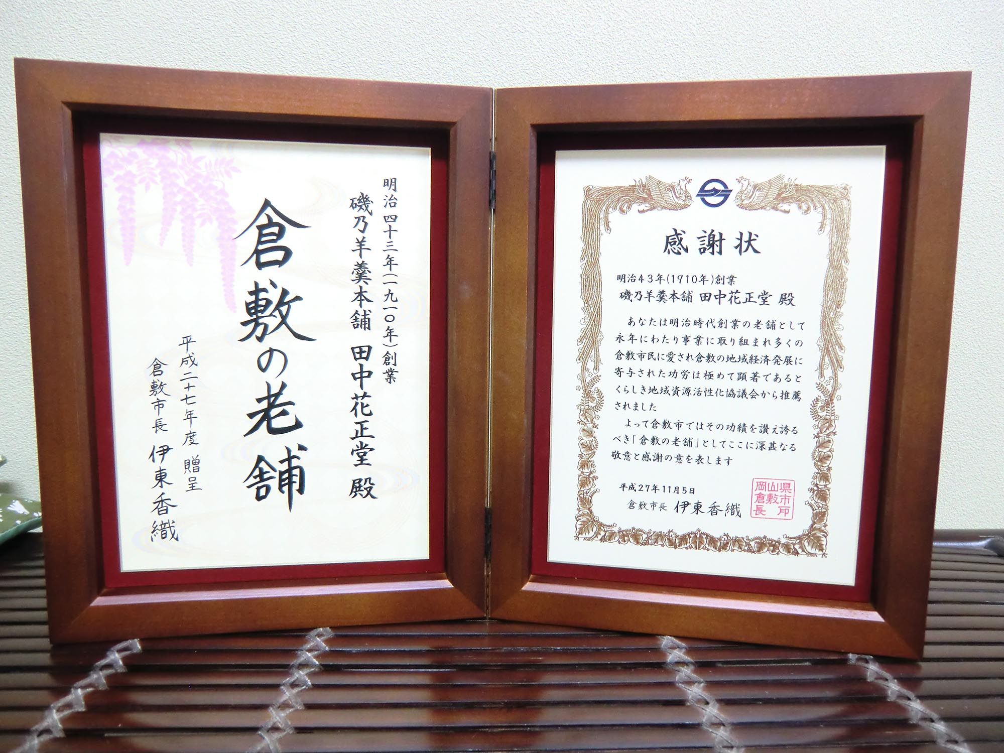 平成27年(2015年)11月5日、倉敷の老舗企業として、くらしき地域資源活性化協議会より感謝状を受賞しました。