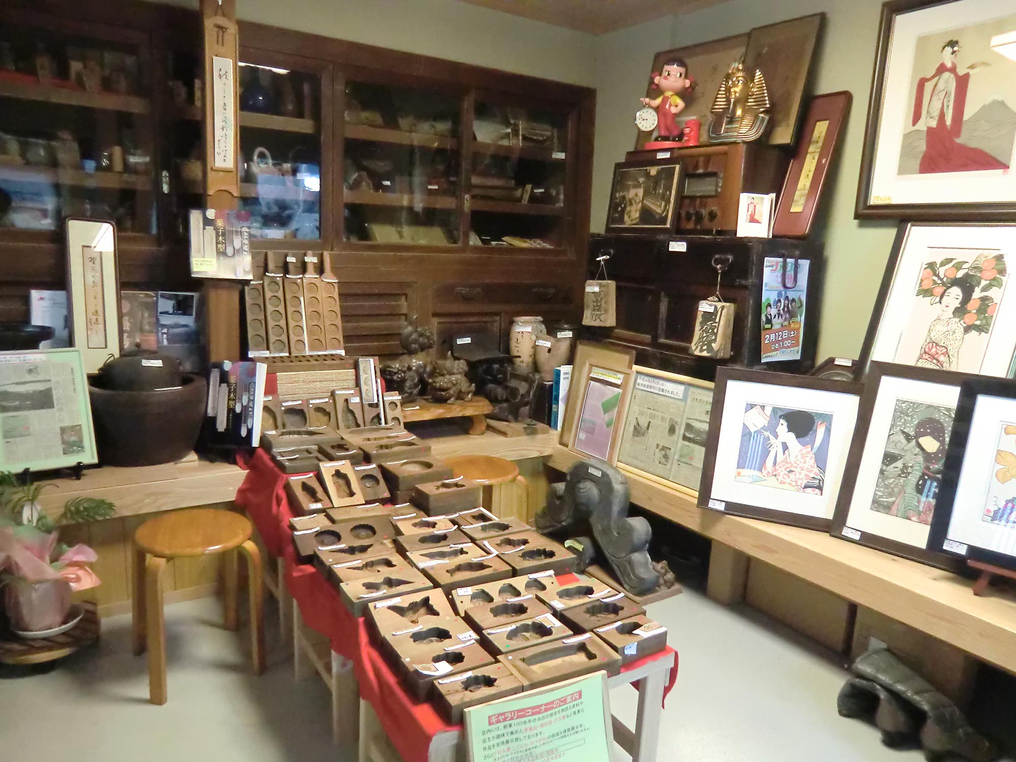 店内には、創業以来110余年の歴史を物語る貴重な品(落雁木型・羊羹製造関連用具・大正時代の判取帳・菓子箱・ラベル他)が展示してます。また店主が趣味で集めた骨董品・備前焼・古文書や竹久夢二、ヒロ・ヤマガタの絵画(版画)も多数常時展示しており、「お土産を買うついでに、アート鑑賞もどうぞ!」と店主は言っております。