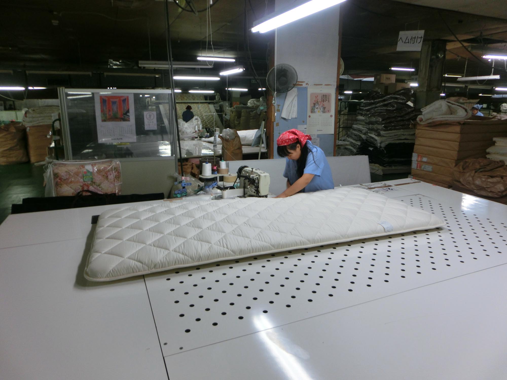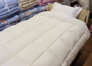 寝具に使用される原料は実に様々。掛布団の中綿だけでも綿・シルク・麻・羽毛・羊毛・カシミヤ・キャメル・機能ポリエステル等があります。また、敷布団にはポリエステル硬綿(自社工場生産)・プロファイルウレタン・ポリエチレンシート等があり、寝具は直接肌に触れるもののため、素材の選択や組み合わせに細心の注意を払って製造されています。