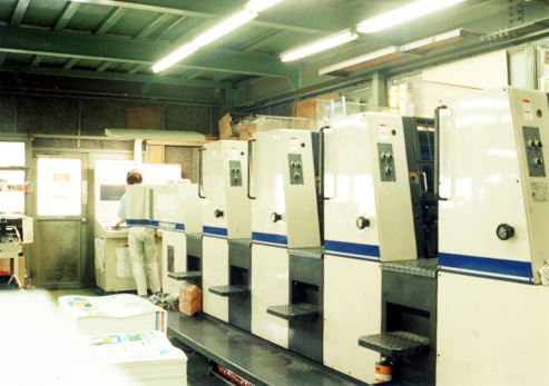 その後、ササベ印刷株式会社として法人化し、昭和37年(1962年)には全国に先駆けて国産小型全自動オフセット印刷機を導入しました。オフセット印刷とは、版の絵柄を一度ゴム製の転写胴に転写(オフセット)し、それを紙に印刷する方式です。当時、同社が導入した「菊四裁全自動オフセット印刷機」は国産小型機としては日本初の1号機ということで多くの同業者が見学に来られたそうです。その後、大型の全自動オフセット印刷機など、日本の高度成長期の需要拡大に対応し、品質安定のため、新たな機械を積極的に導入していきました。昭和49年(1974年)には、総合印刷の一貫体制を確立すべく、旧工場に隣接して約1000平方メートルの新工場を建設、移転しました。