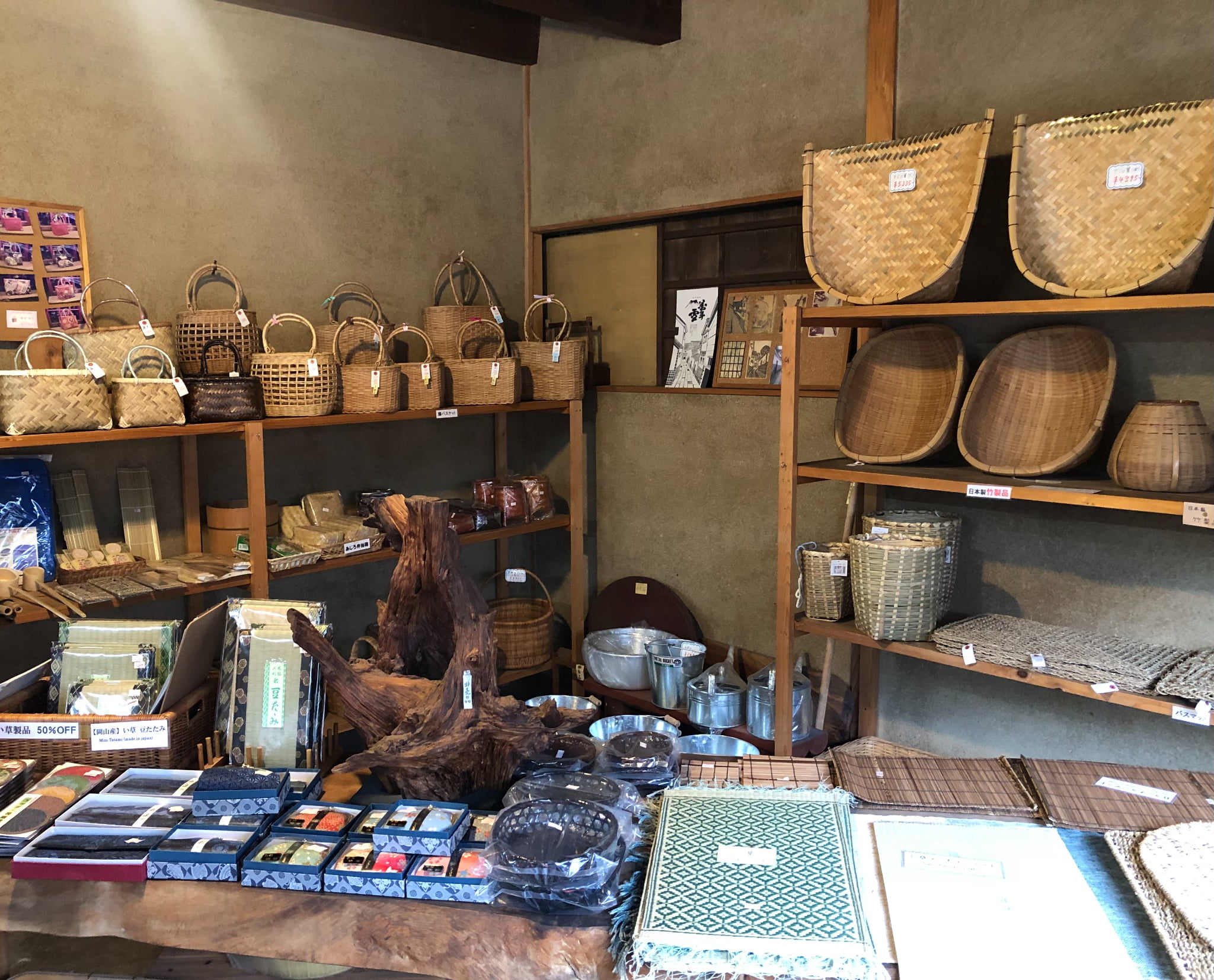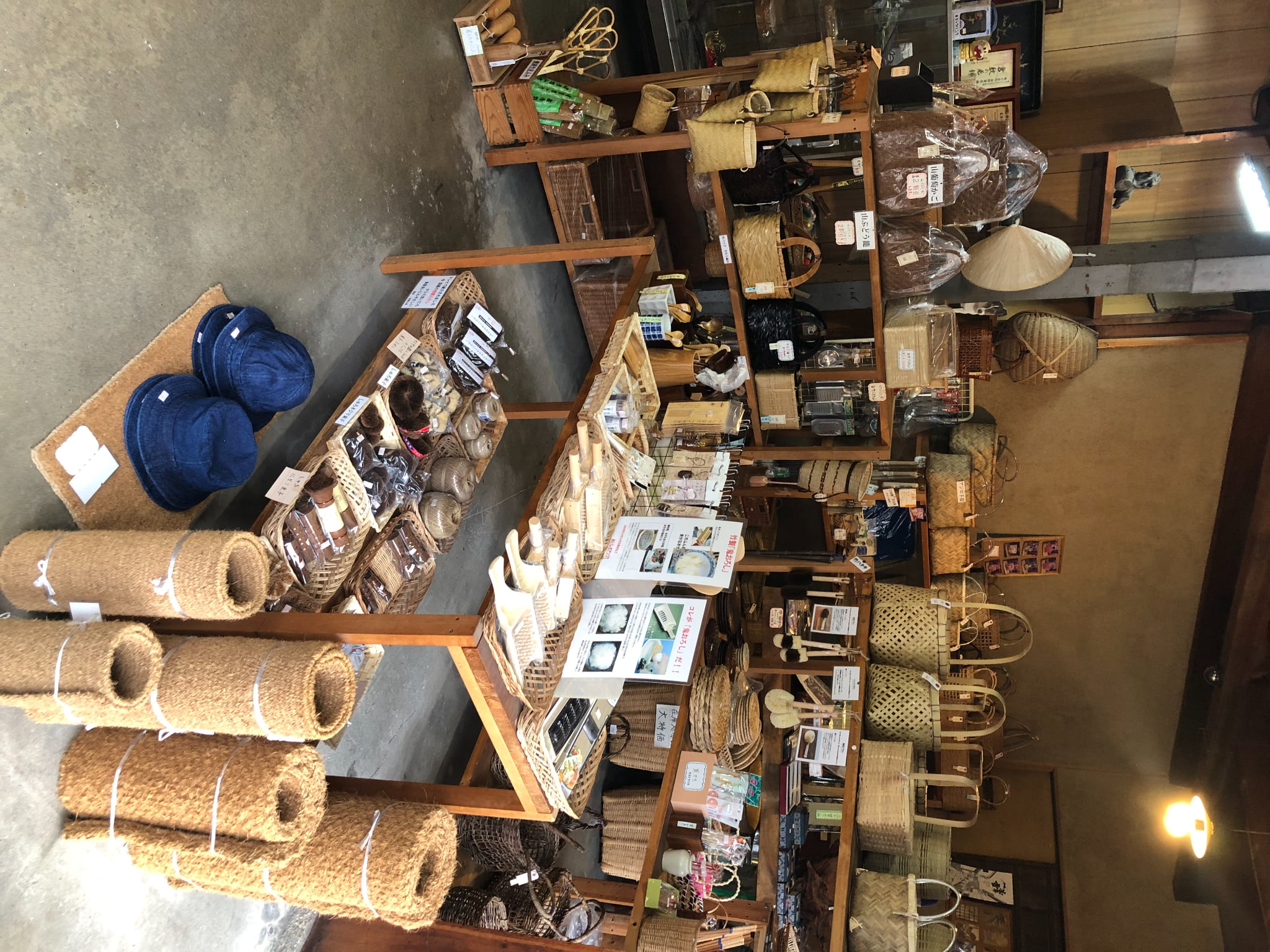 店に並ぶ商品は、自然素材を使った日用雑貨が中心。特に観光客向けには竹やい草を使った素材の温かみを感じさせるものが人気があります。また、座敷ほうきなどの最近は売っている所が少ない日用品を地元の人が探しに訪れることもしばしば。買い物ついでに雑談をしていく常連さんの姿も多く見られます。