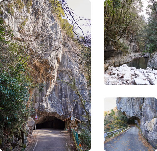 県道300号線に沿って、石灰岩質の渓谷が約2㎞続きます。滝や断崖などが散在。新緑や紅葉の名所、クライマーの聖地としても人気を集めています。鍾乳洞の一部を利用した羽山第二トンネルの通り抜けはスリル満点です。