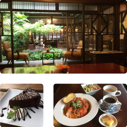 建築当時の贅を凝らした造作や中庭、調度品がレトロモダンな雰囲気を演出。蔵書が並ぶ半個室で読書も満喫。日替わりランチ、自家焙煎コーヒー、地元産イチゴと高梁紅茶や備中宇治茶のエスプレッソティー・ゼリー使用のフルーツアイスクリームパフェなど、メニューも豊富です。