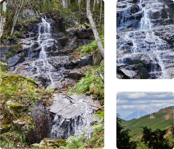 花見山の水が集まり、下の谷へと岩肌を流れ落ちている場所です。下の滝、上の滝、幻の滝の三段からなり、総落差は24mほど。いぶきの里から歩きやすい滝見道が整備されており、特に水量が多い春から夏がおすすめです。