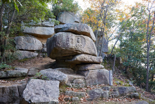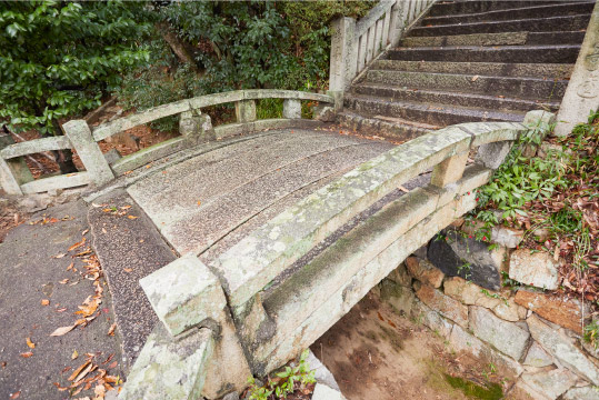 約千年前、平安時代初期の創建と伝わる鴨神社。参道の途中、随神門近くに小さな石橋が架かっています。古くから里謡で鴨方三奇として「鴨方に過ぎたるものが三つある。拙斎・索我・宮の石橋」とうたわれた石橋のことです。橋の下は水路ではなく、東西を行き来する地元の人の道でした。江戸時代に整備された鴨方往来と参道を結ぶための策として、道を立体交差させた先人の知恵に驚かされます。また、石橋の造りにも工夫が凝らされています。長い板状の石を6枚、アーチ状に削り出し、地震の際の横ずれに耐える構造を取り入れているとのこと。江戸時代の橋梁技術の高さが垣間見えます。