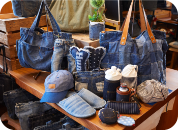 浅口市鴨方町を拠点にジーンズ洗い加工業を展開する企業が、デニム素材の素晴らしさを身近なアイテムで提案。使い込むほどに味わいが増す、愛着の出る物作りを目指しています。コースターからバッグ、エプロン、ソファまで、豊富なバリエーションと日本製の品質の高さが特徴です。オールラウンダーなデニム素材なのでプレゼント選びにおすすめ。