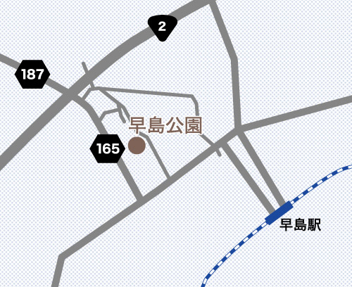早島町の中心に位置し、丘陵地の自然環境を活かした公園です。高台にあるため、遠く南の常山や金甲山まで見渡すことができます。公園内は城山公園と国鉾公園の二つのエリアからなり、城山は桜、国鉾はツツジが有名。四季折々の花が楽しめる町民の憩いの場として愛されています。近隣には、江戸時代に早島を統めた旗本戸川家の記念館(日曜・祝日開館)やいかしの舎があり、早島駅から歩いてのアクセスも可能です。