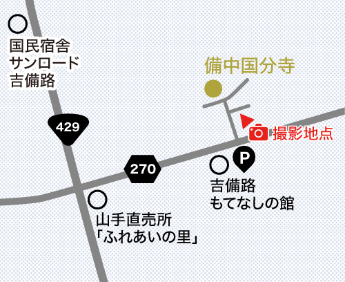 県内有数の観光名所。境内にそびえる高さ約34mの五重塔は国の重要文化財に指定されています。奈良時代に聖武天皇の発願によって全国に建立された国分寺のひとつで、仏教の力を借りて天災や飢饉(ききん)から国を守ることを目的に建てられました。建物は南北朝時代に焼失したと伝えられ、現在の建物は江戸時代中期以降に再建されたものです。市の南部、アカマツにつつまれた丘陵地のほぼ中心部に位置。広々とした田園風景のなかに佇む五重塔の姿はあまりにも有名。吉備路の代表的景観として、近年ではサイクリングスポットとしての人気も高まっています。
