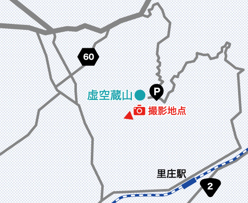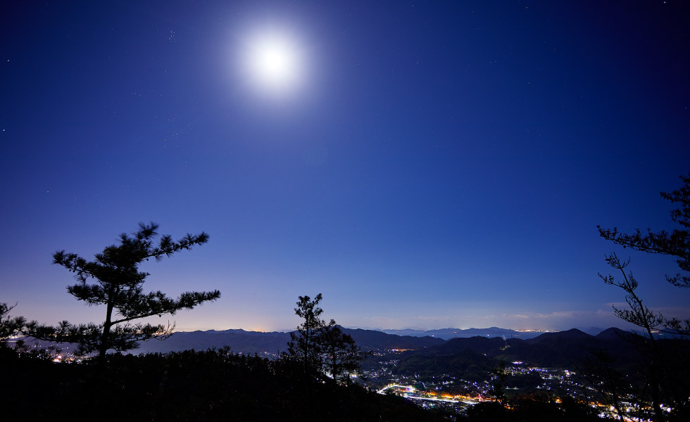 「虚空蔵山 奥の院」裏山の石の上より南東に向けて撮影。頂上近くの奥の院まで舗装道路がありますが、その後10分ほど山道を歩きます。夜間は足元が大変危険なので、懐中電灯持参とトレッキングシューズを履いて撮影スポットへ向かってください。山頂には大岩があり、金属製の梯子で登ってからの岩上での撮影になります。三脚を立てる場合も十分注意しましょう。