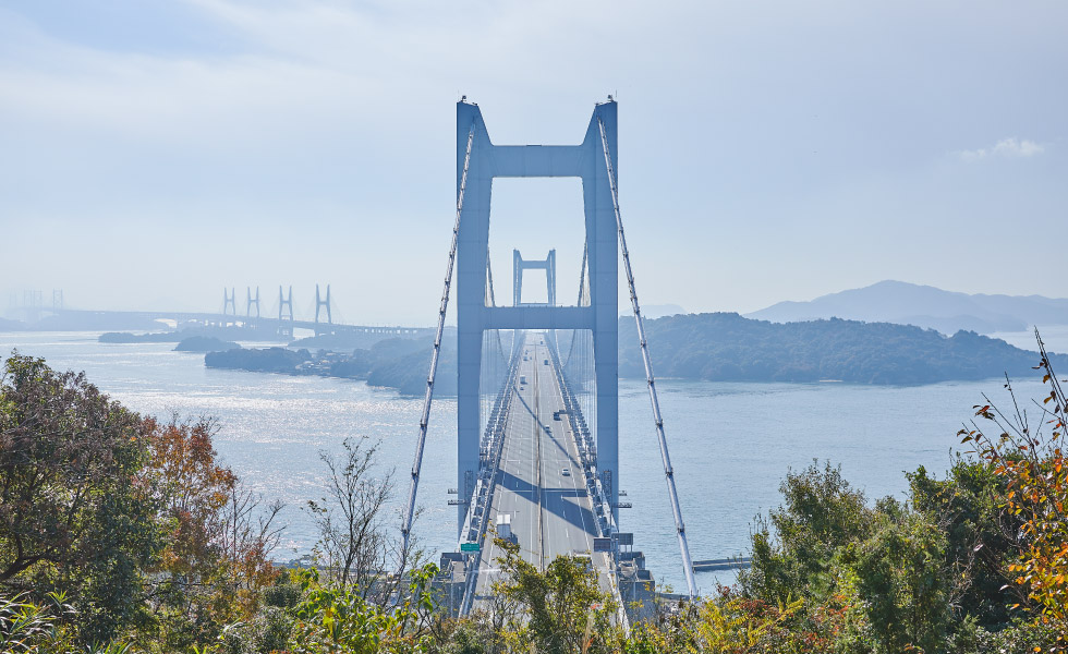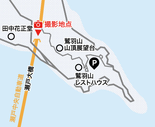 鷲羽山山頂展望台を通り過ぎ、最奥に位置する「あずまや展望台」から南に向けて撮影。瀬戸大橋を間近に捉えた撮影ができます。