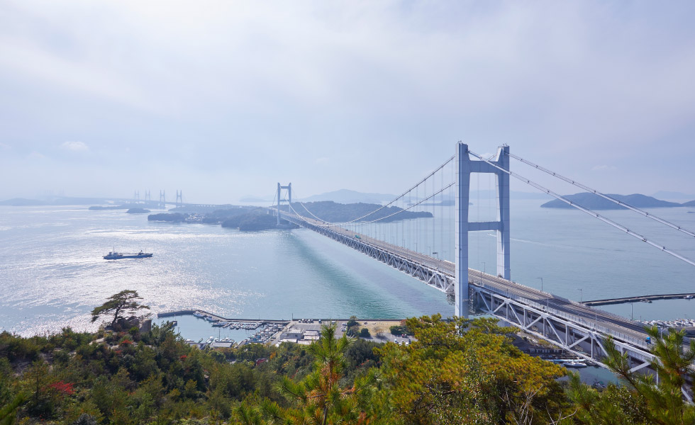 鷲が羽を広げた様子に似ていることから「鷲羽山」と名付けられました。日本初の国立公園として知られる瀬戸内海国立公園の代表的な景勝地。NPO法人日本列島夕陽と朝日の郷づくり協会による「日本の夕陽百選」にも選定されました。山頂付近には、展望台やビジターセンター、レストハウスなどがあり、それらを結ぶように遊歩道が整備されています。標高133mの山頂「鍾秀峰(しょうしゅうほう)」からの、雄大な瀬戸大橋と瀬戸内海の多島美を一望できる景観はまさに圧巻。土曜・祝日にはライトアップされた瀬戸大橋の夜景も見られます。